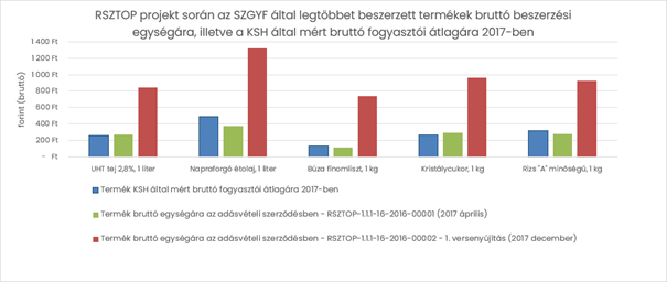 A túlárazás mértékét jól szemlélteti a következő ábra, ami azt mutatja, hogy az RSZTOP-1.1.1-16-2016-00002 projekt során az élelmiszercsomagokba szánt 1 kilogrammos kristálycukrot az SZGYF a KSH által mért bruttó fogyasztói árak majdnem ötszöröséért vásárolta meg. Már a program kezdetén az átlagosan 266 forintos kristálycukrot 960 forintért szerezték be, öt évvel később még ez az összeg is növekedett, 1036 forintra (szemben az akkori 262 forintos átlagárral).